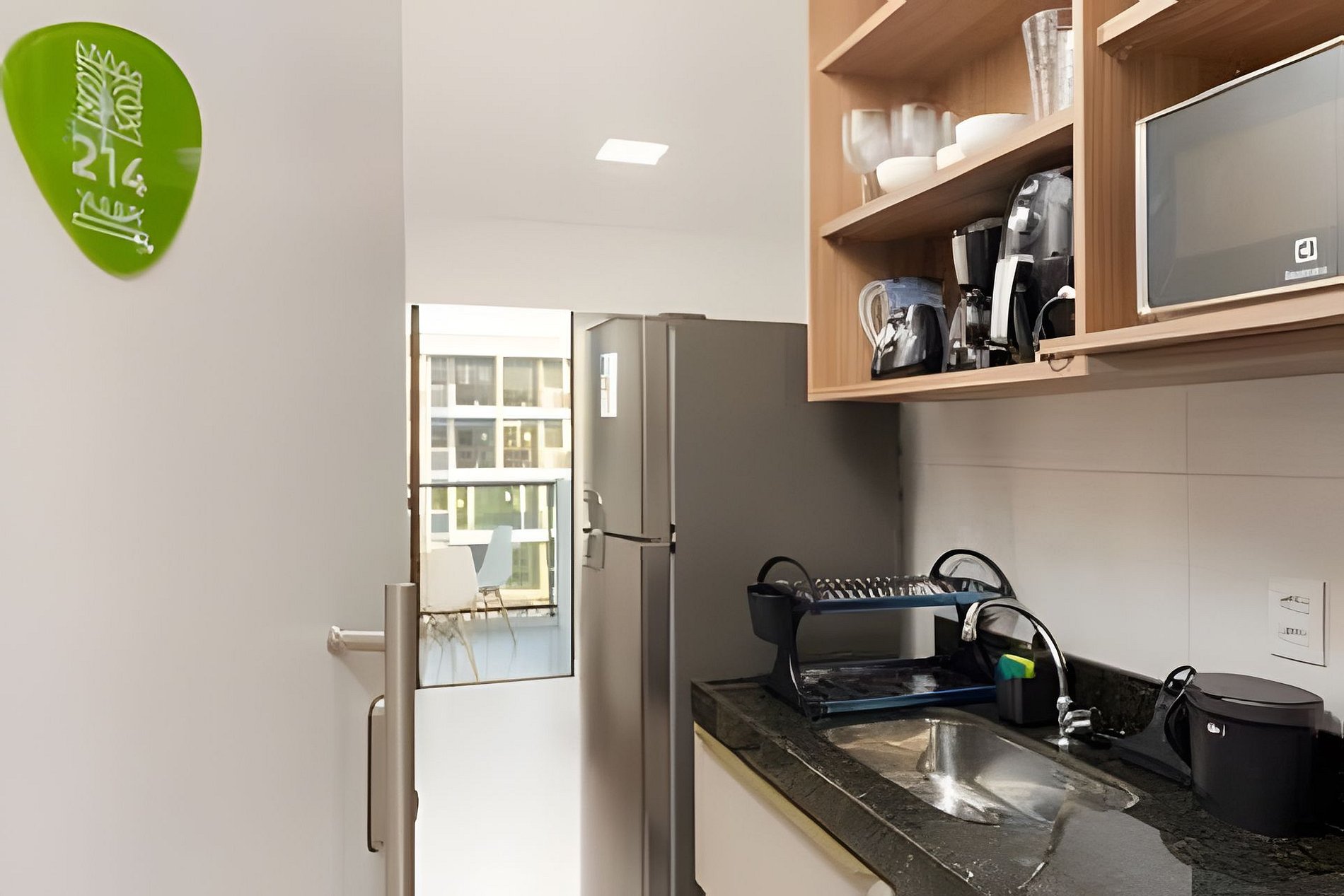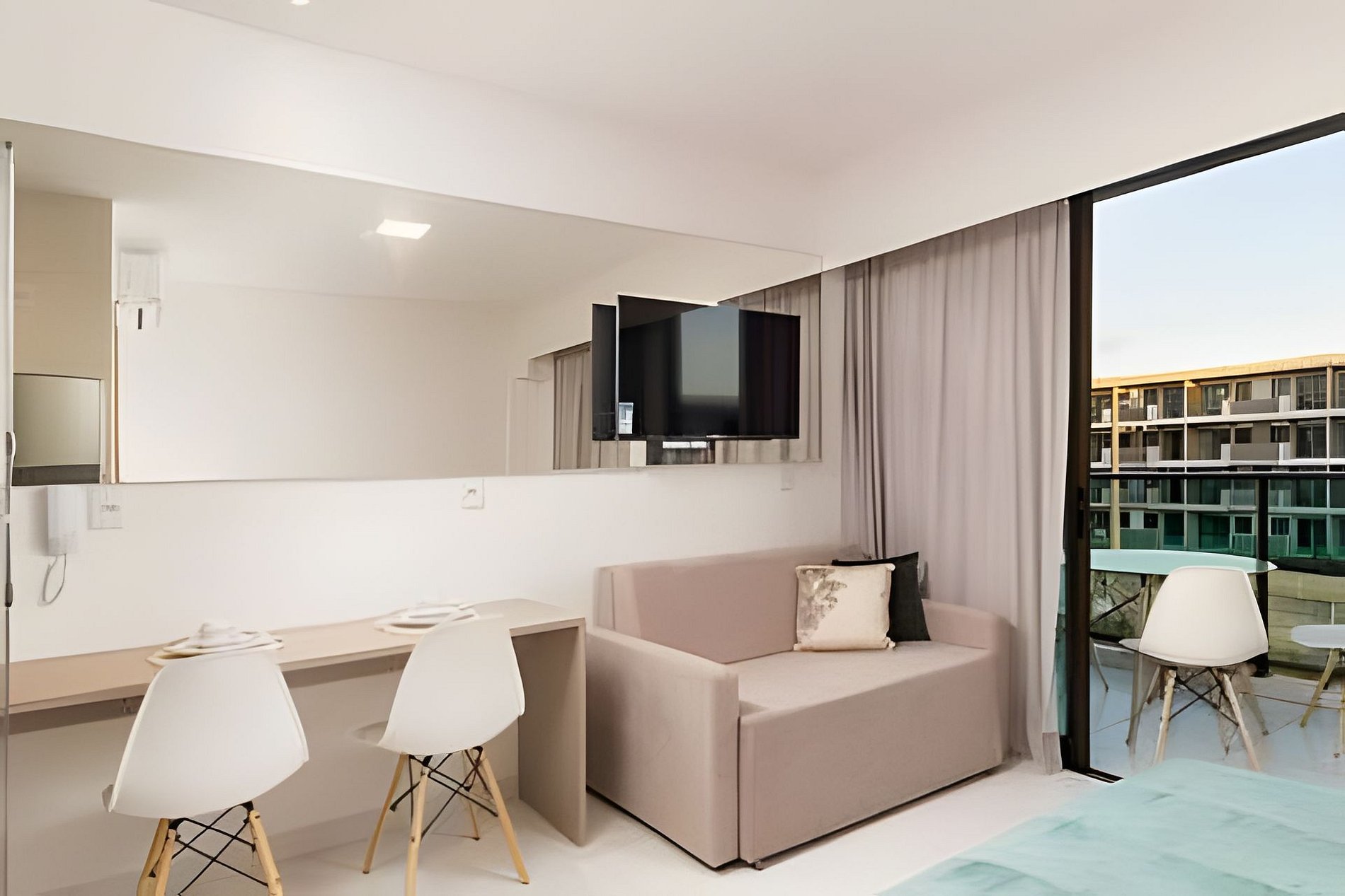 O apartamento foi planejado para oferecer praticidade e aconchego em cada detalhe. Com ambiente integrado e climatizado, acomoda confortavelmente até quatro pessoas, contando com cama de casal e sofá-cama, além de TV e uma charmosa varanda com vista para o empreendimento — perfeita para relaxar após um dia de praia. A cozinha compacta é totalmente equipada com geladeira, cooktop, micro-ondas, cafeteira, utensílios e bancada para refeições rápidas, garantindo autonomia durante toda a estadia. O banheiro moderno possui acabamento de alto padrão, com box em vidro e excelente iluminação.