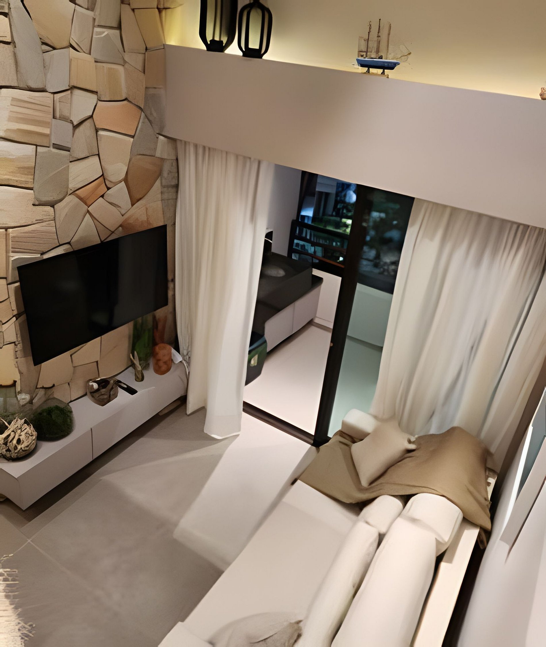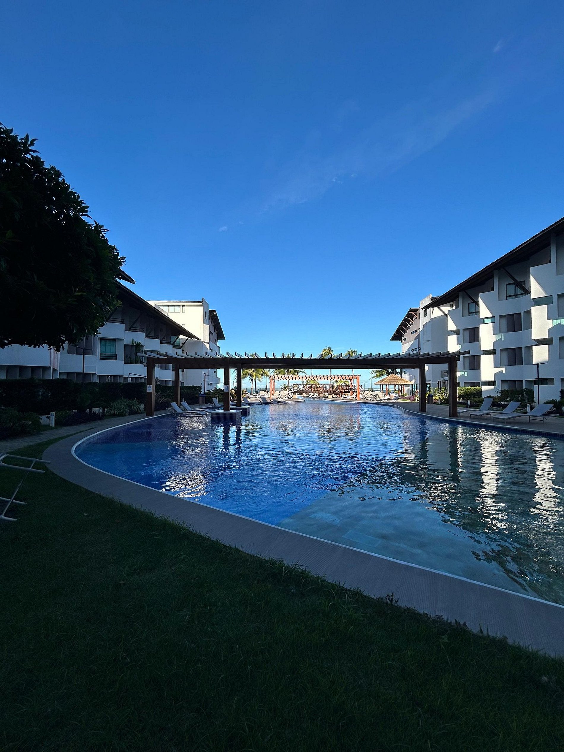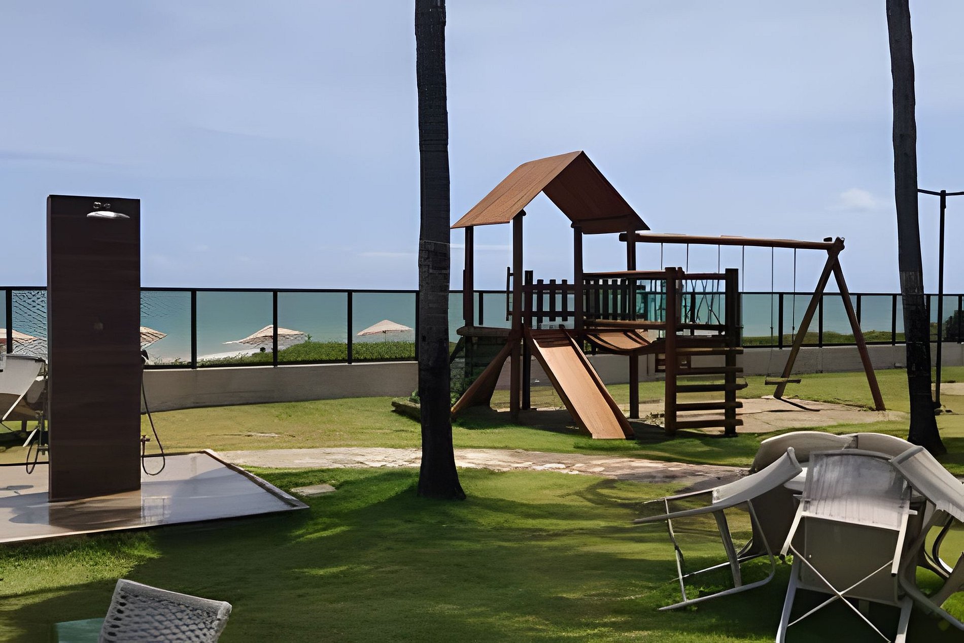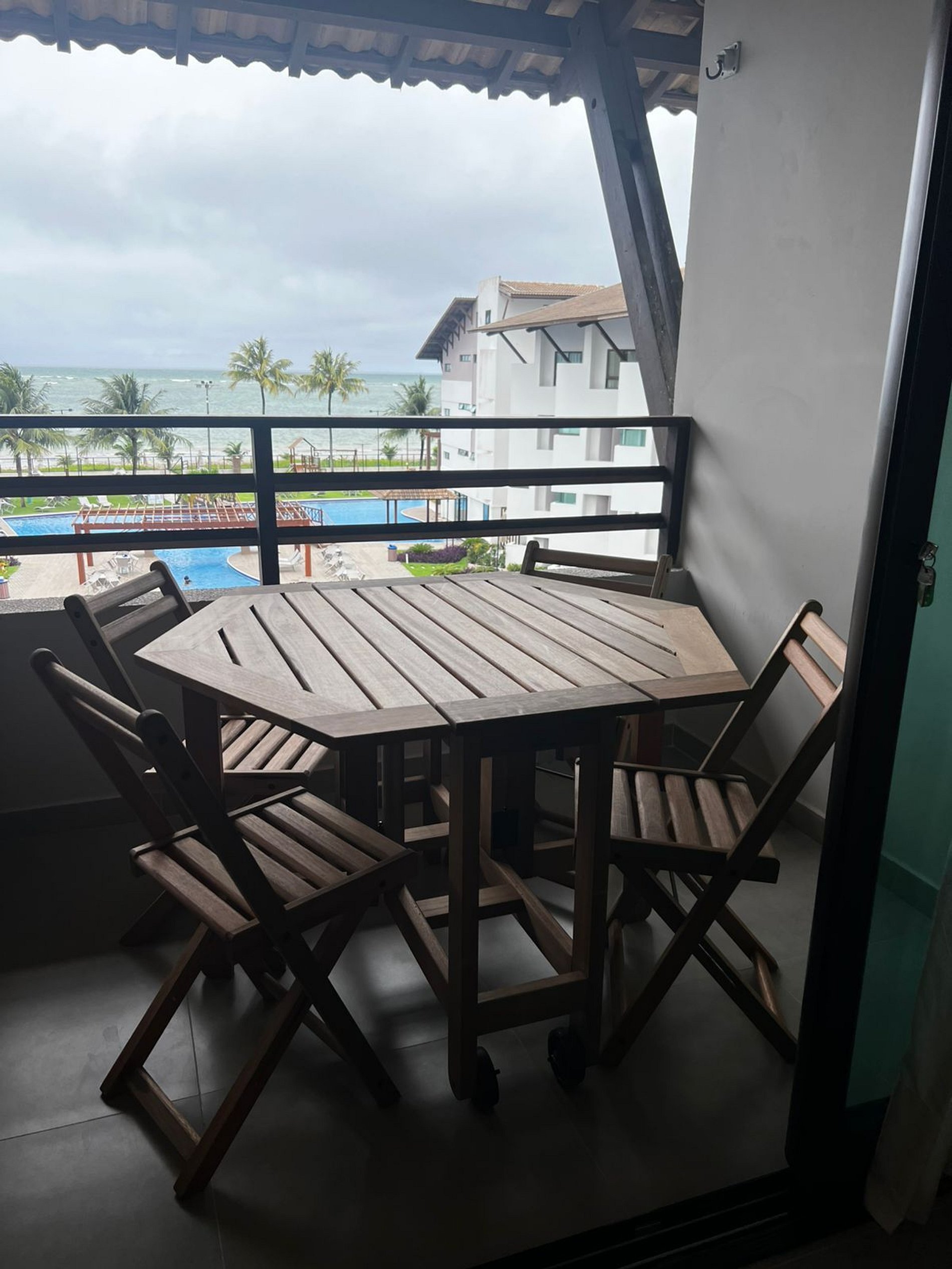 Flat amplo com 3 quartos, sendo 2 no mezanino. Varanda de frente para o mar e para as piscinas.
