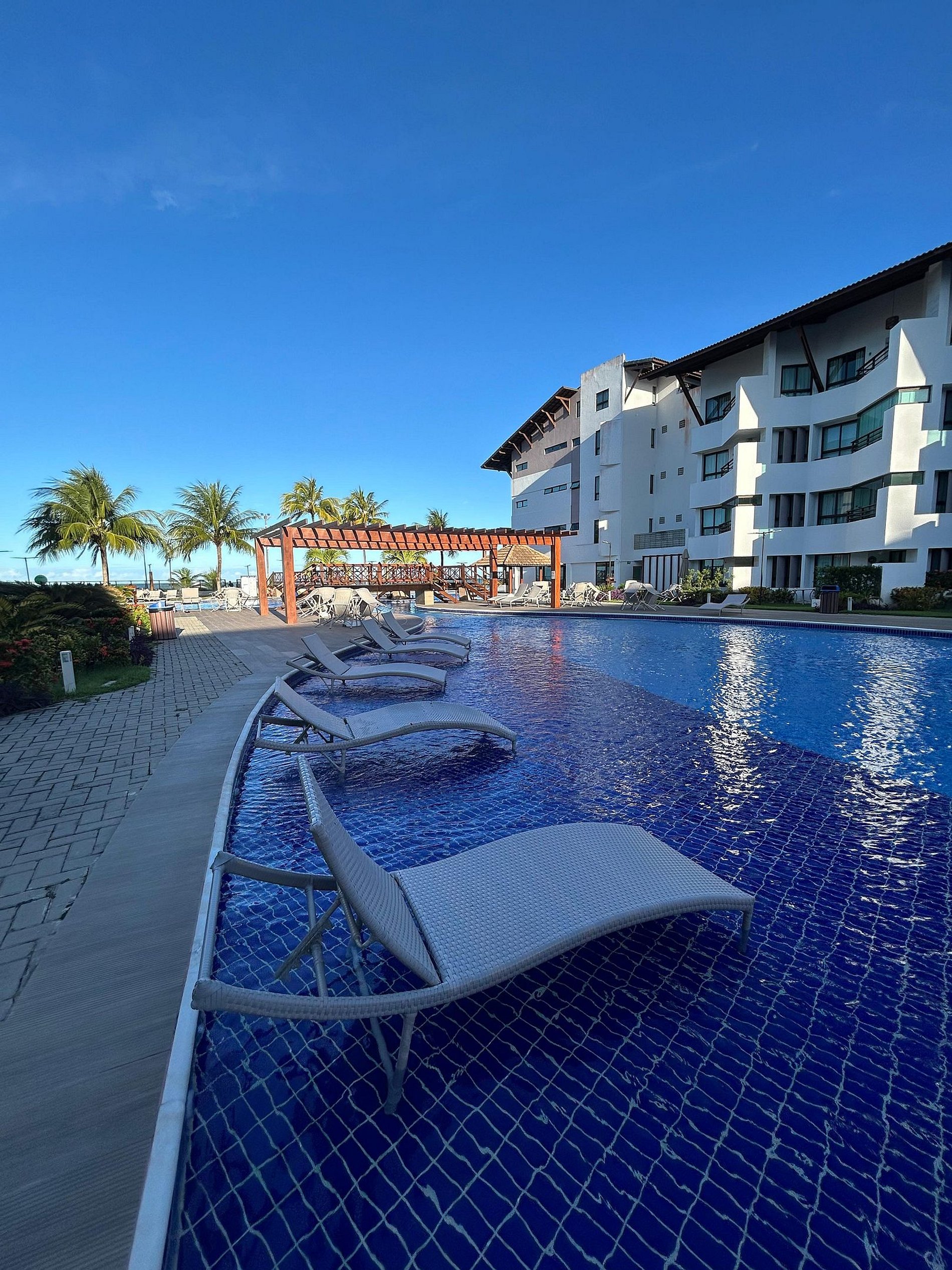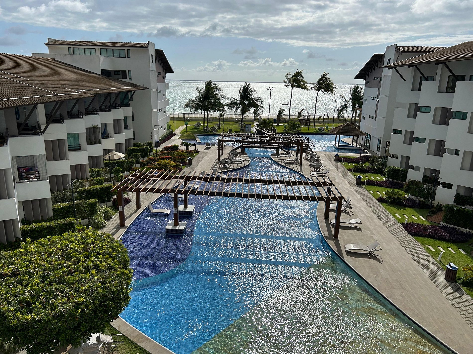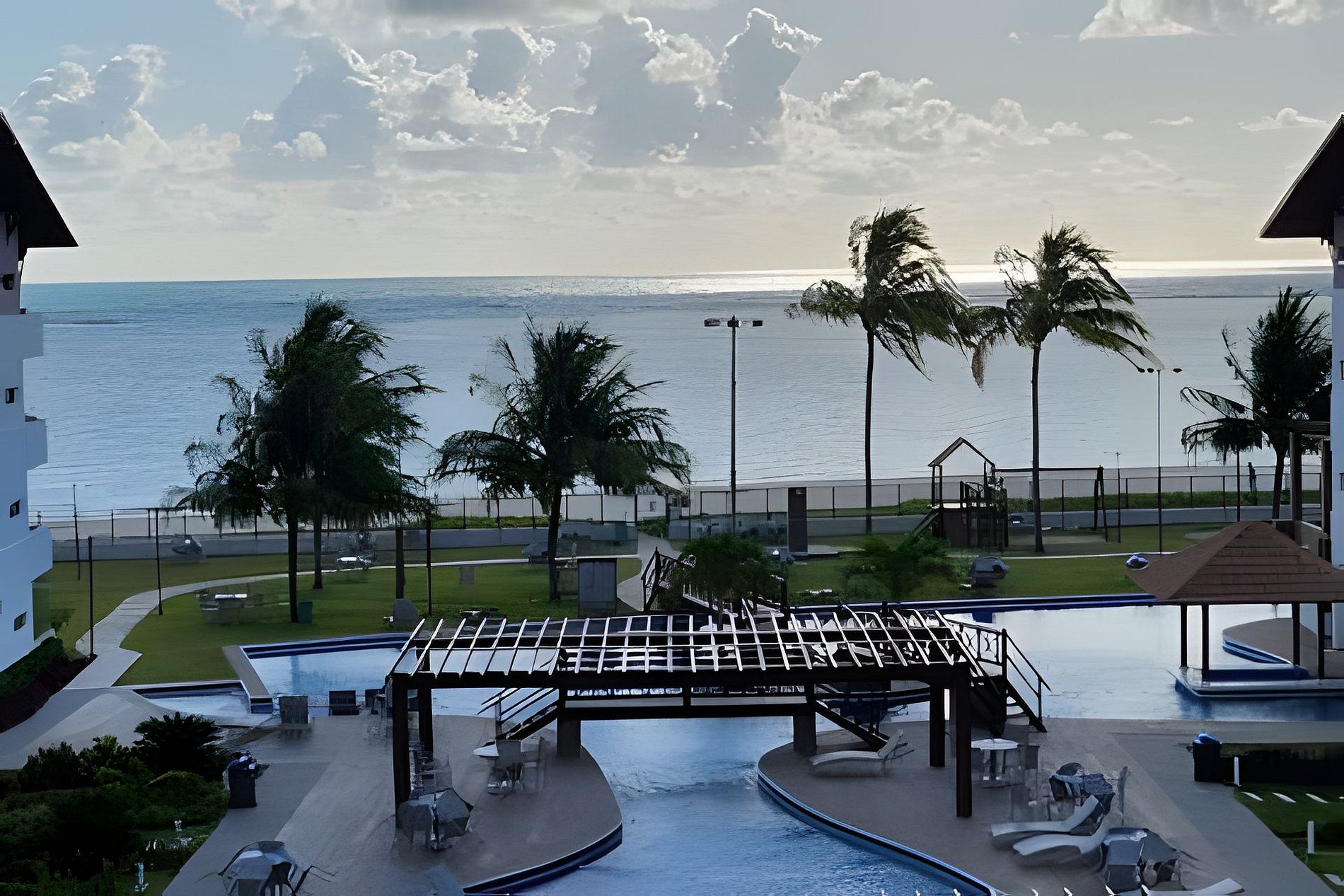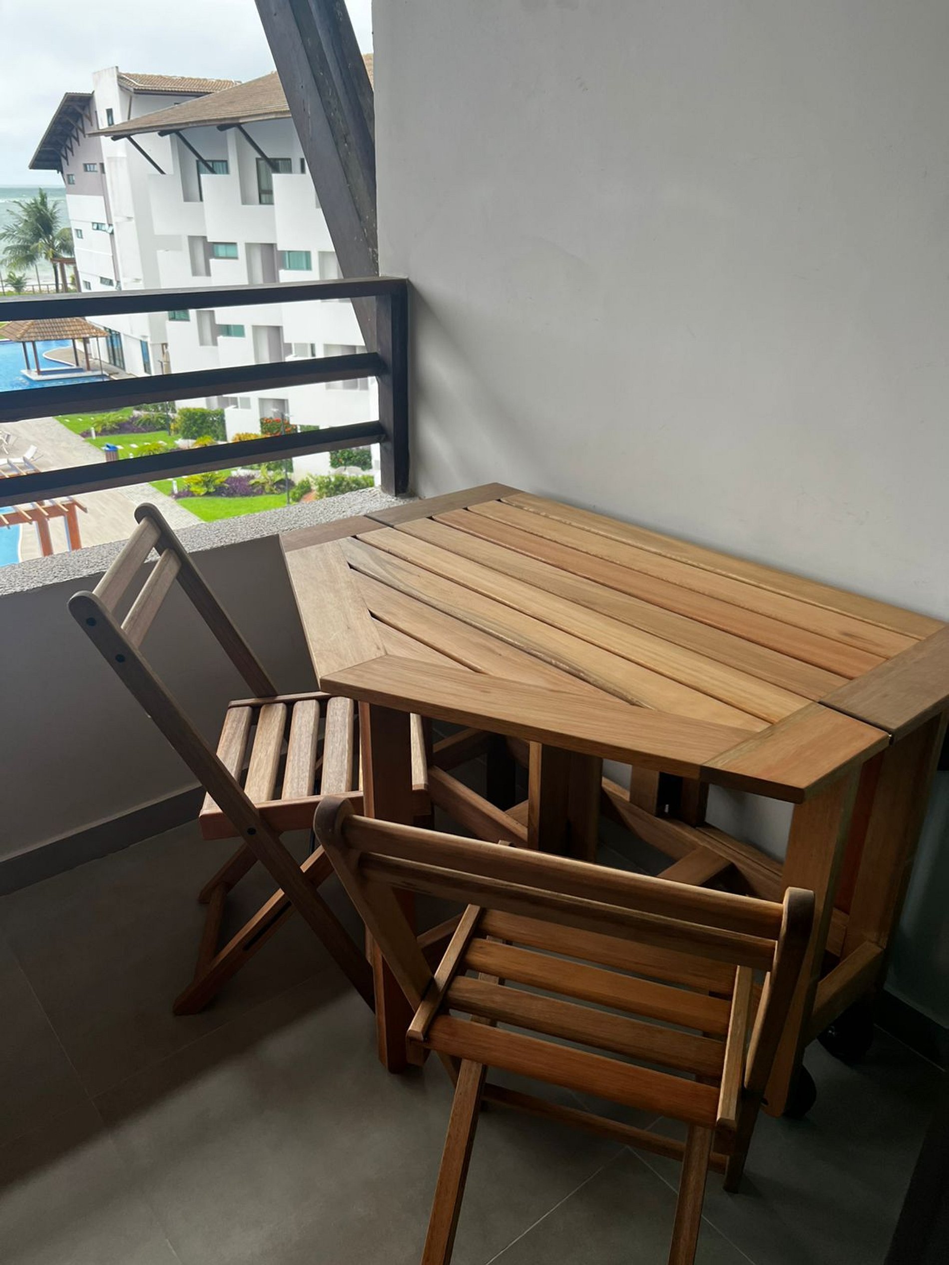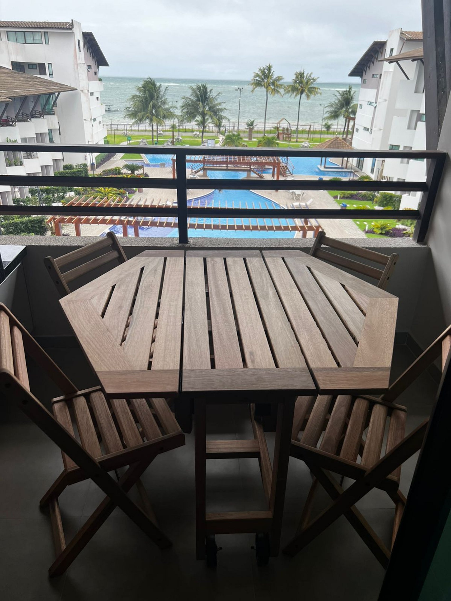 Flat amplo com 3 quartos, sendo 2 no mezanino. Varanda de frente para o mar e para as piscinas.
