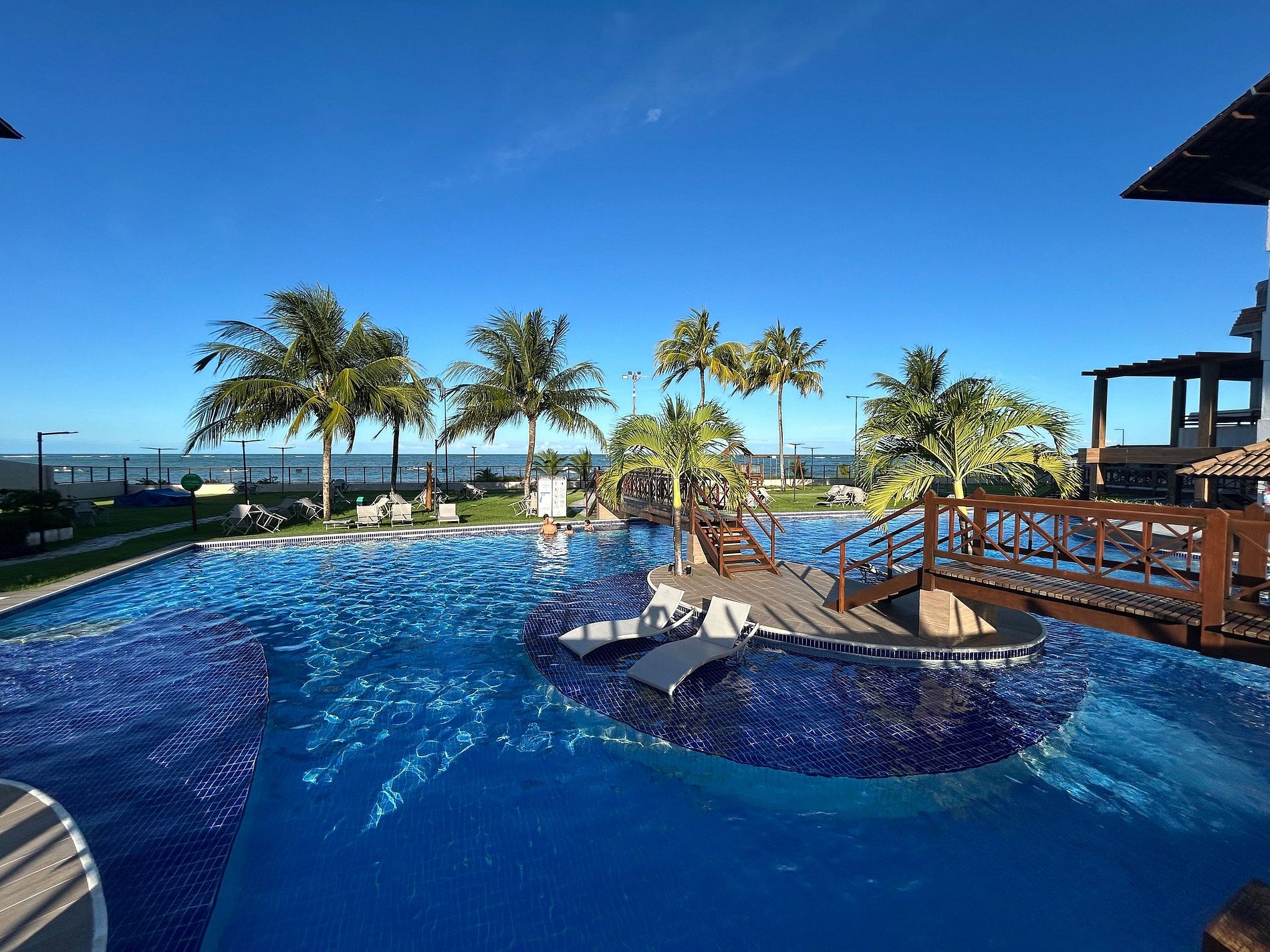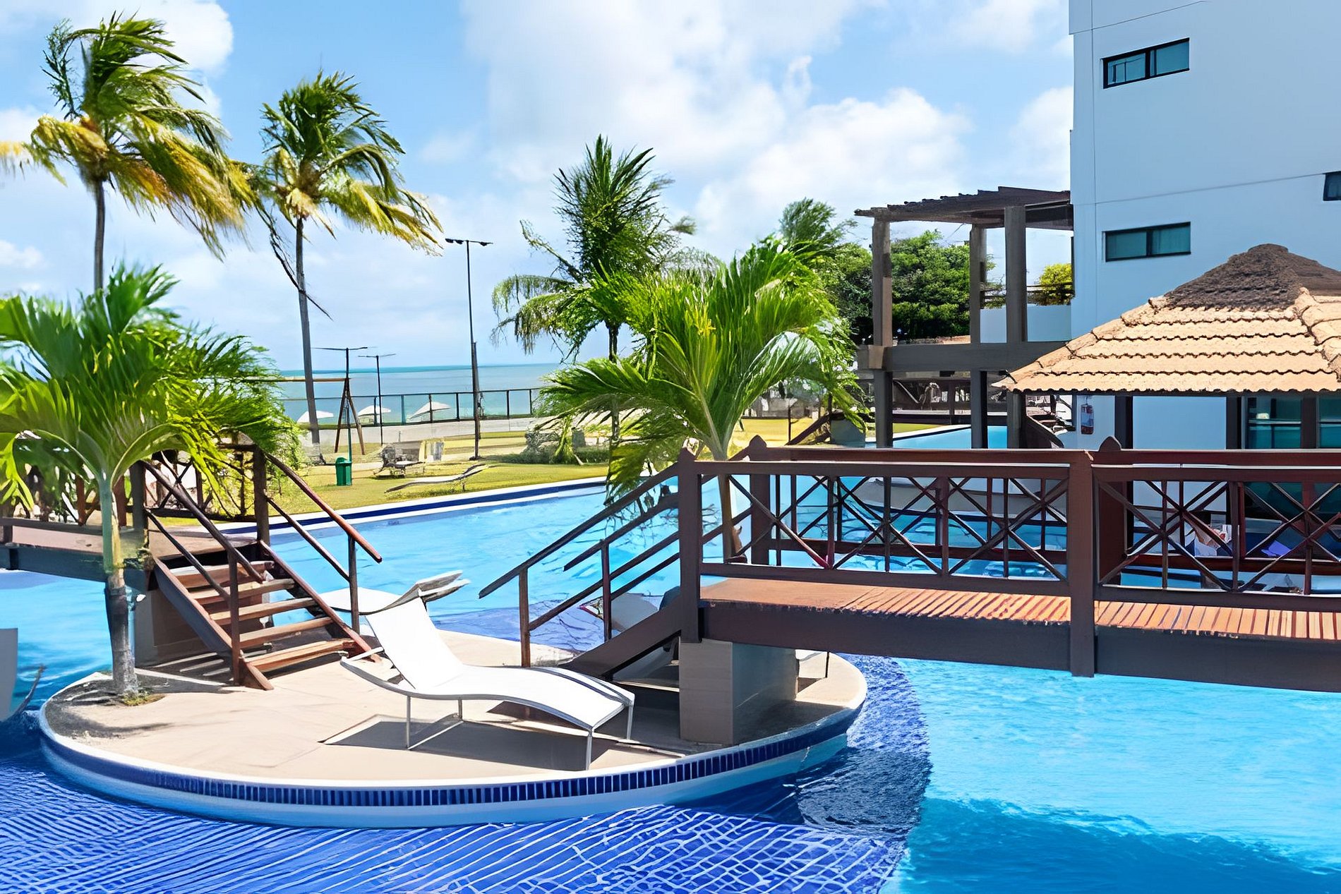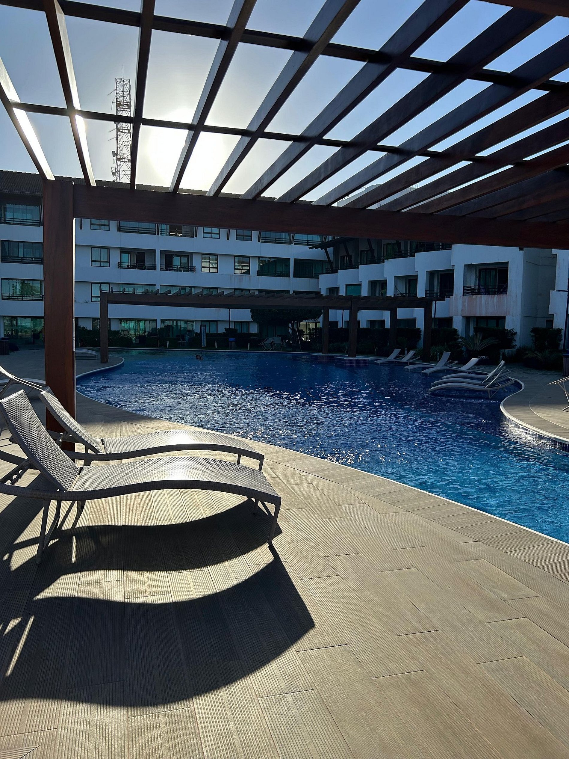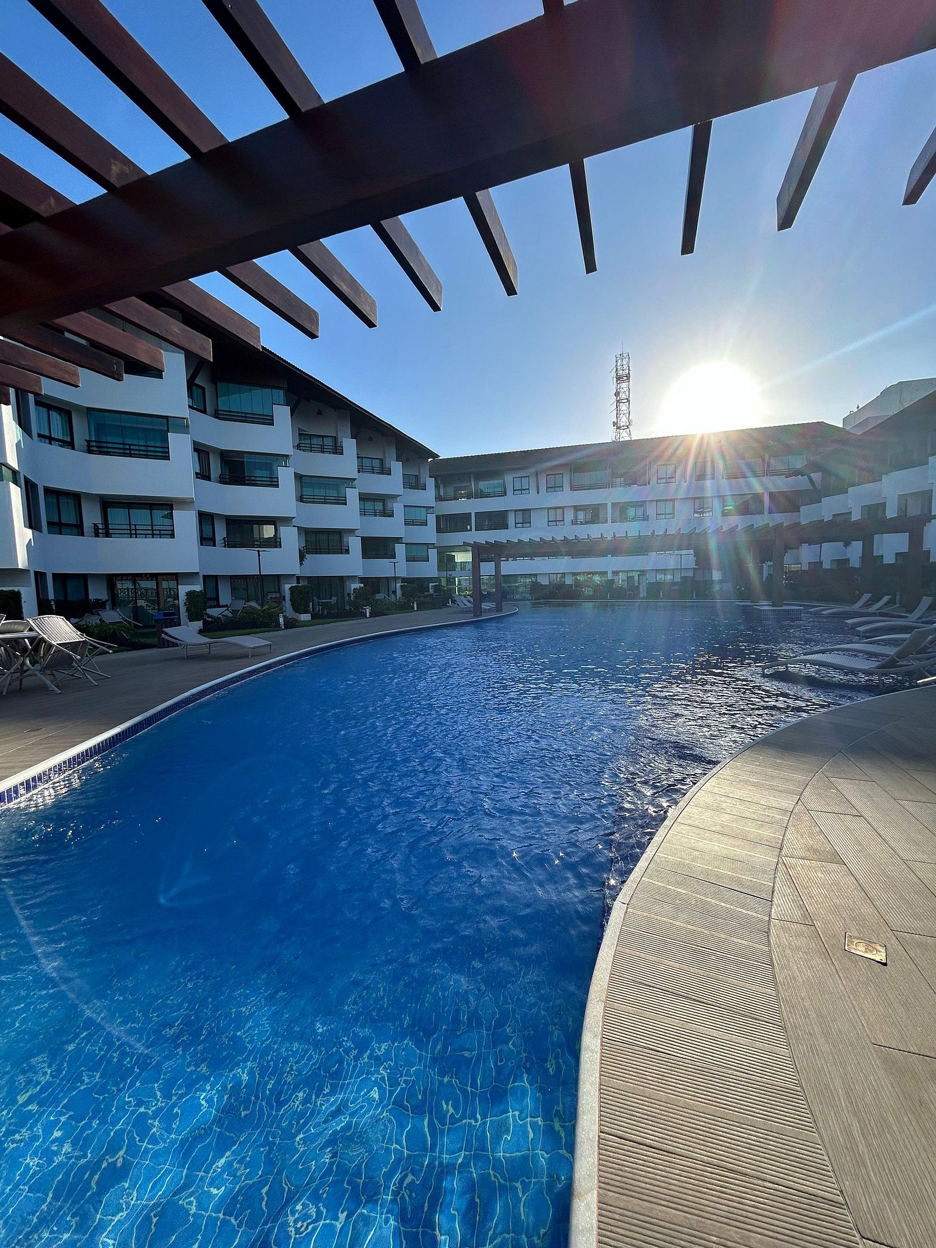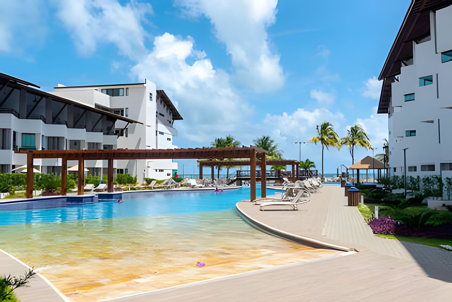 Flat amplo com 3 quartos, sendo 2 no mezanino. Varanda de frente para o mar e para as piscinas.