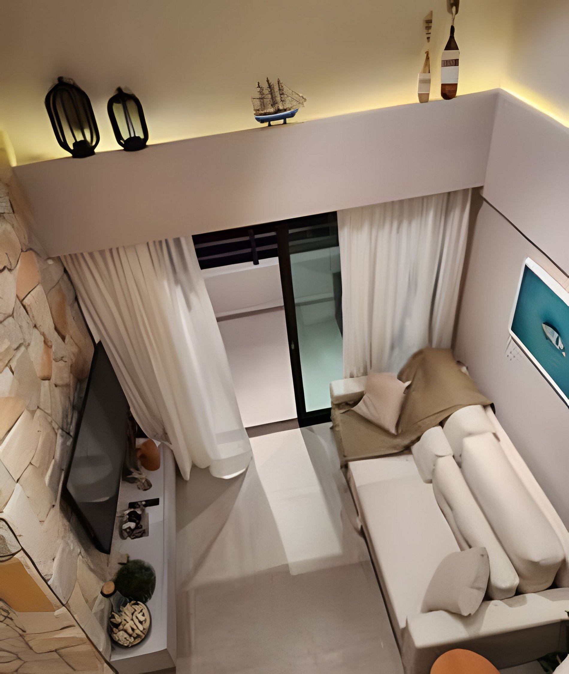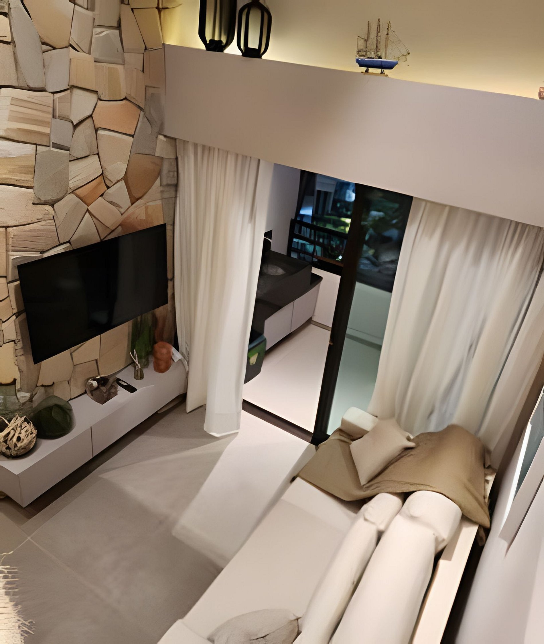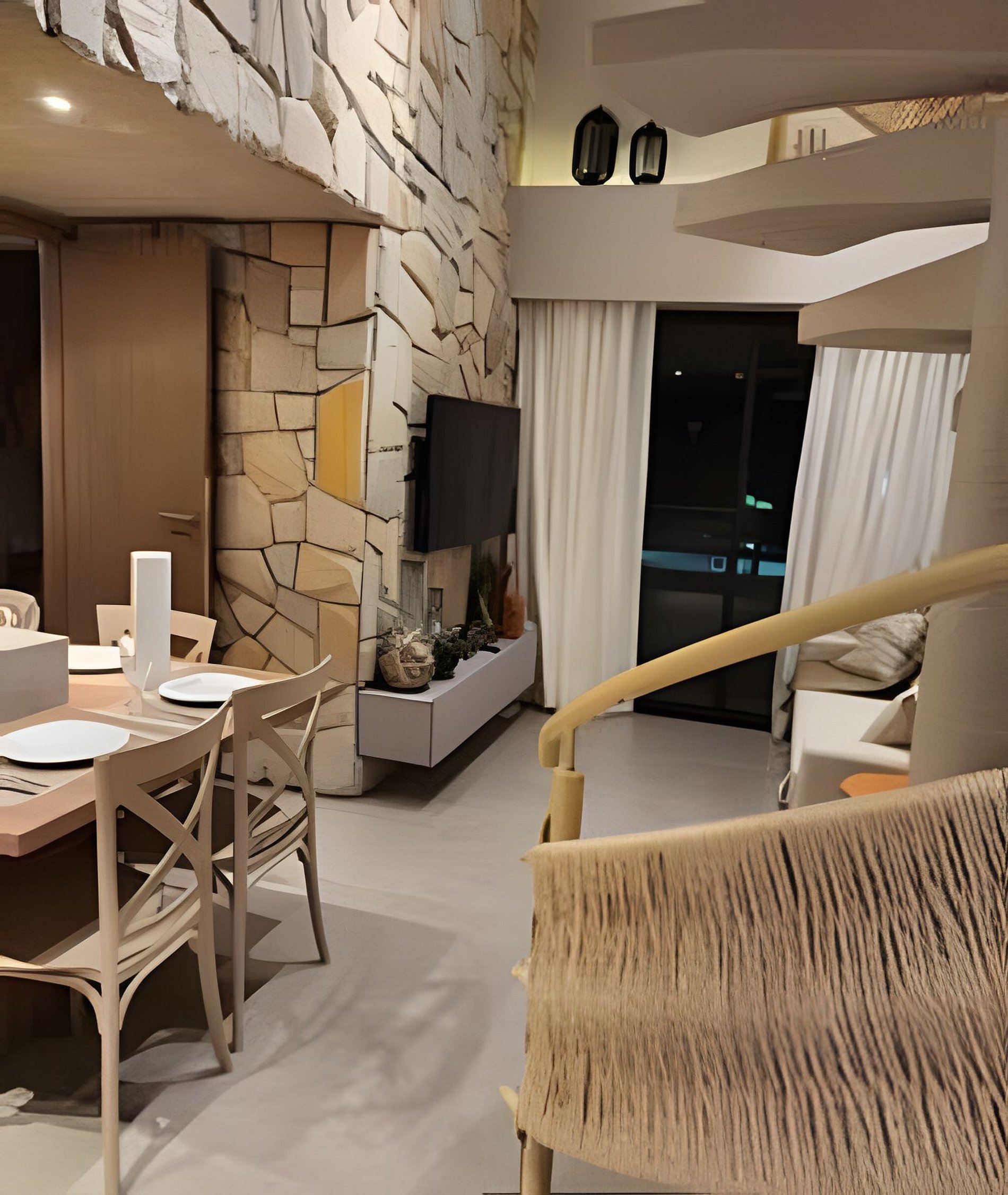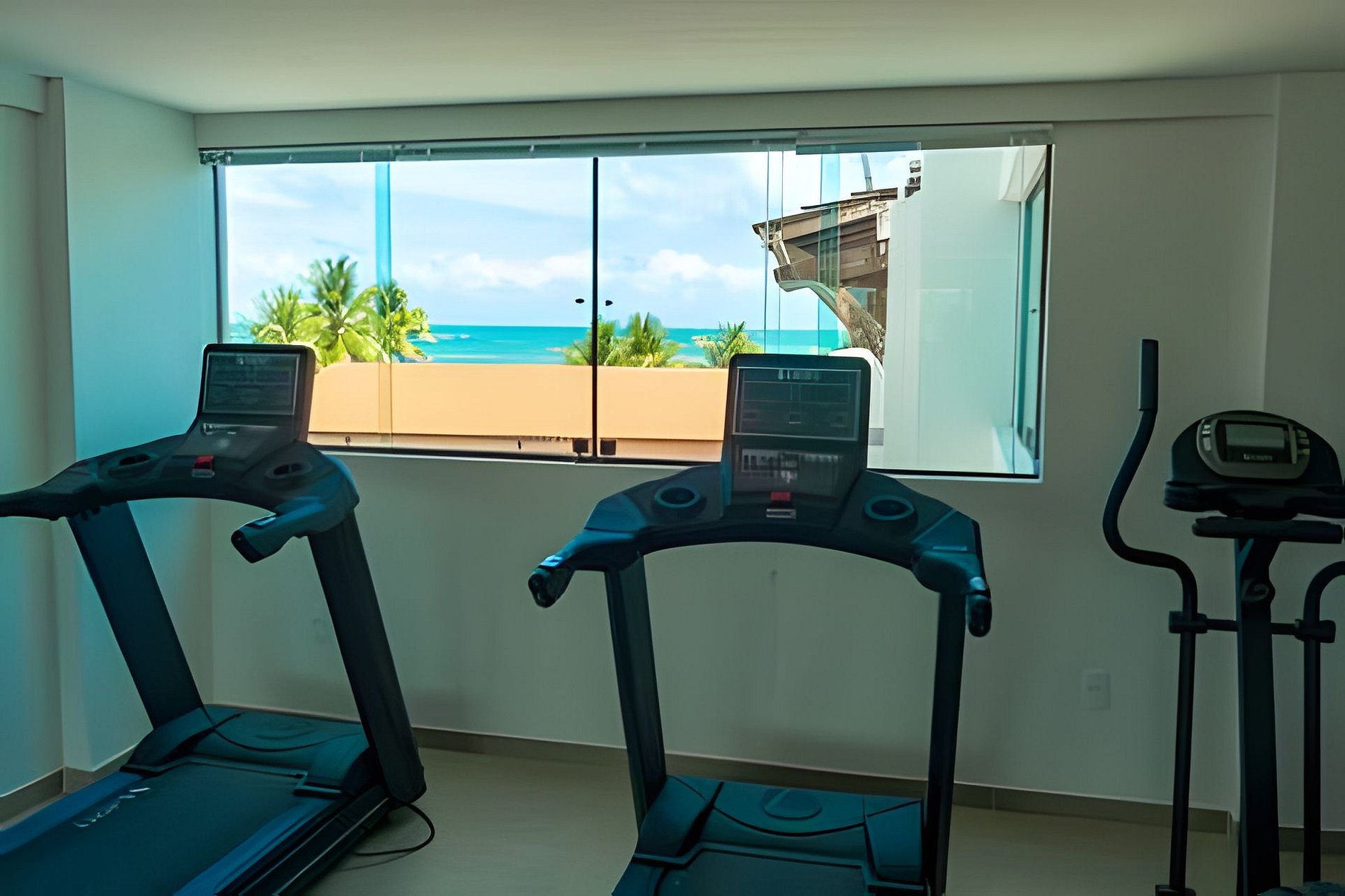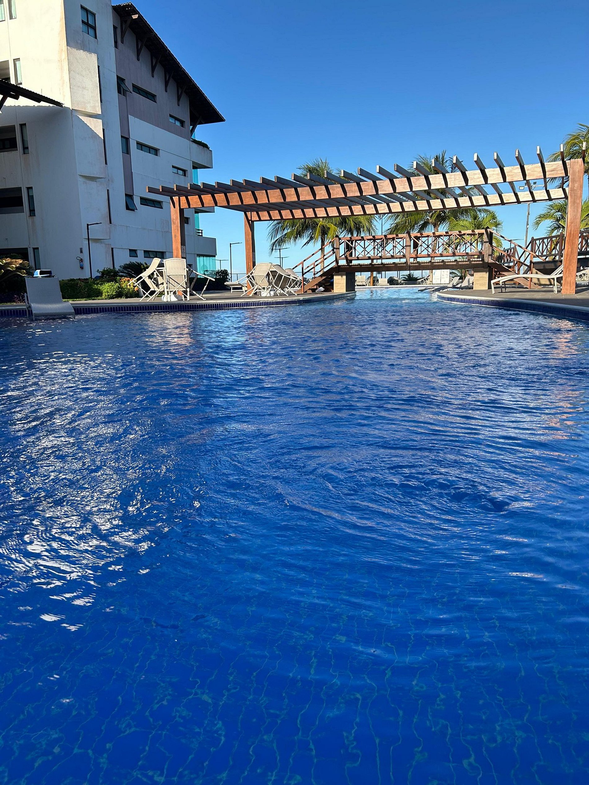 Flat amplo com 3 quartos, sendo 2 no mezanino. Varanda de frente para o mar e para as piscinas.