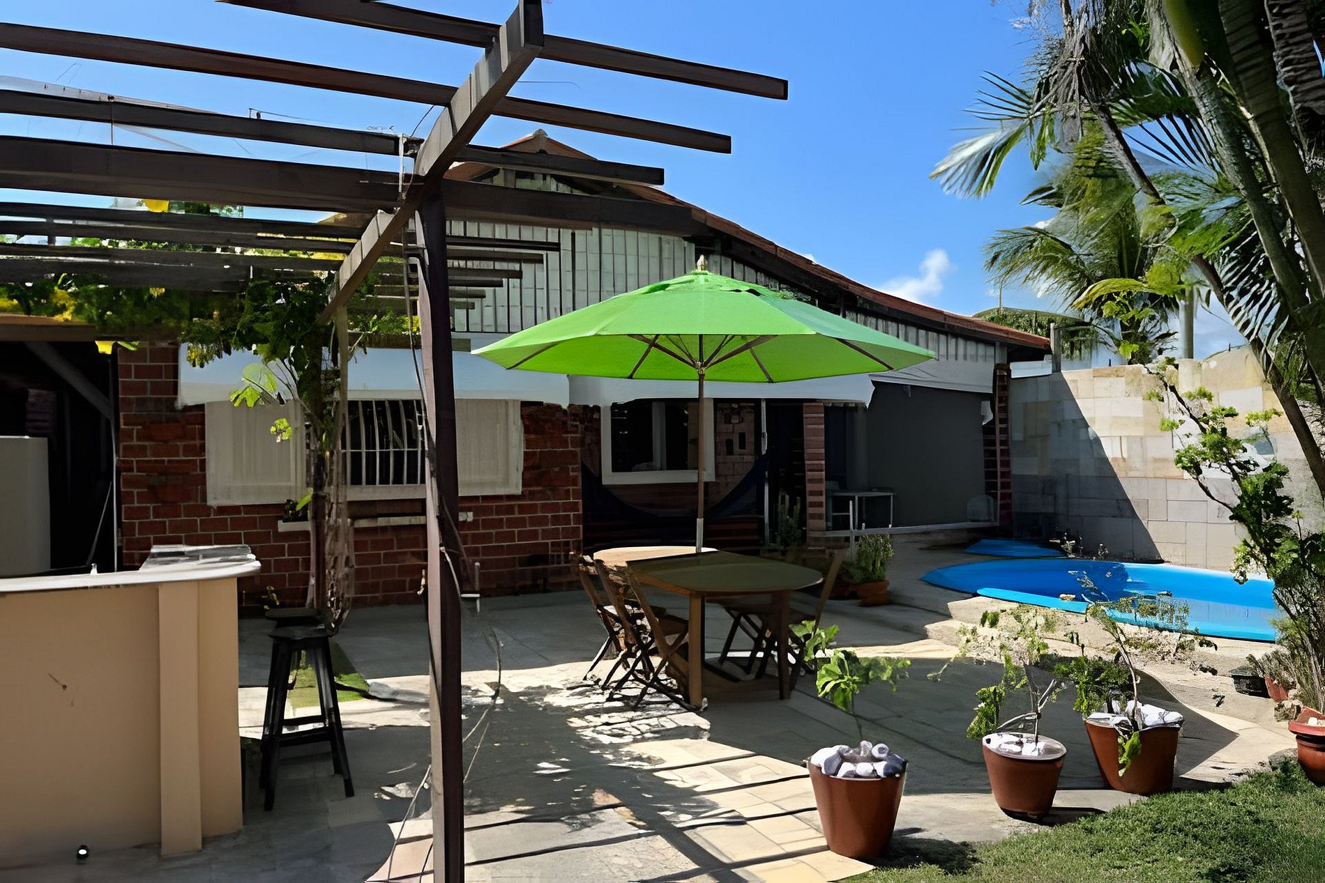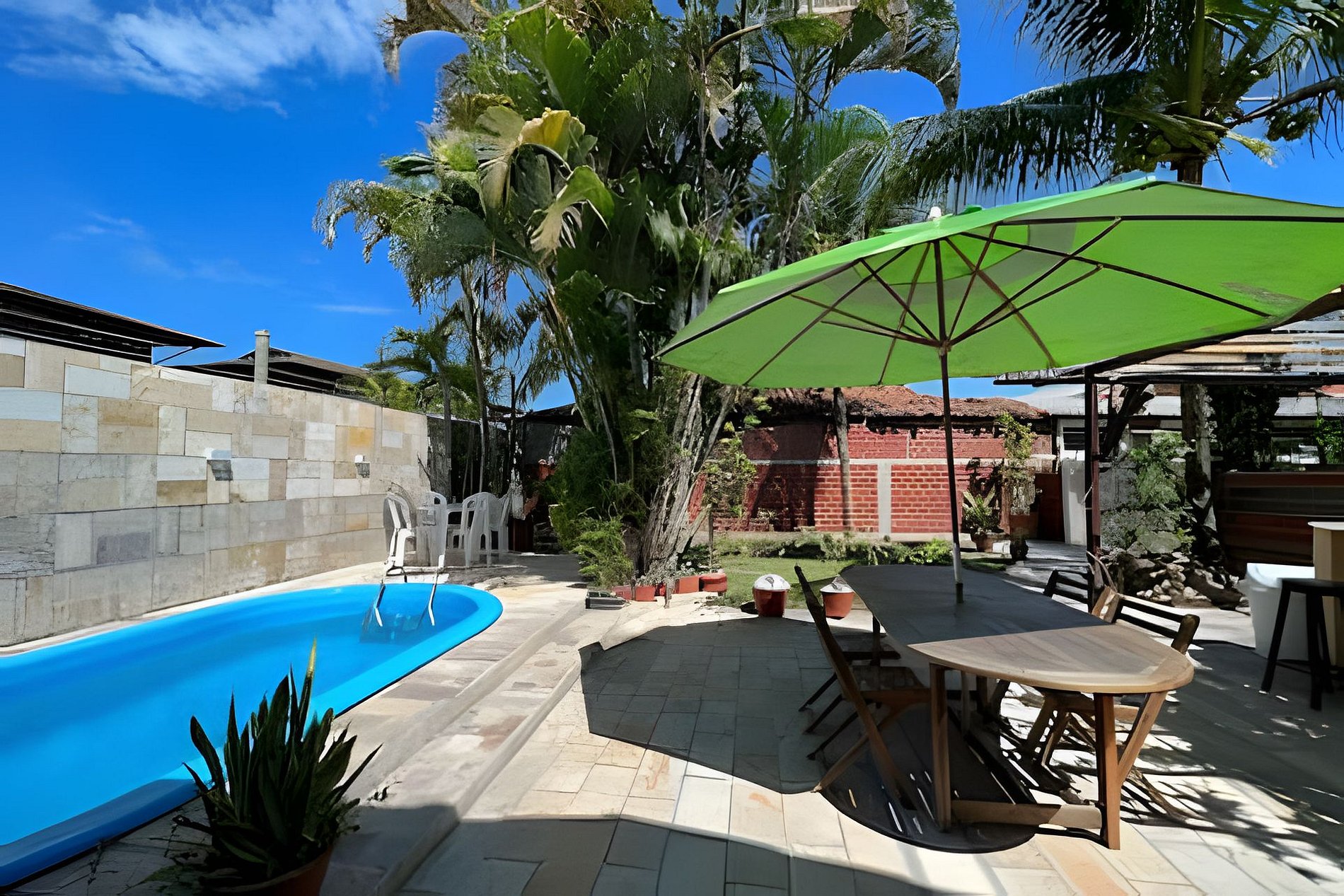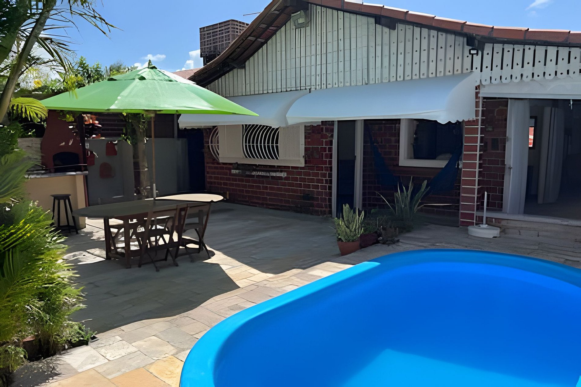 3 quartos, sendo 1 suíte, cozinha completa, banheiro social, sala de estar, sala de jantar, varanda, churrasqueira no jardim ao lado da piscina e estacionamento privativo.