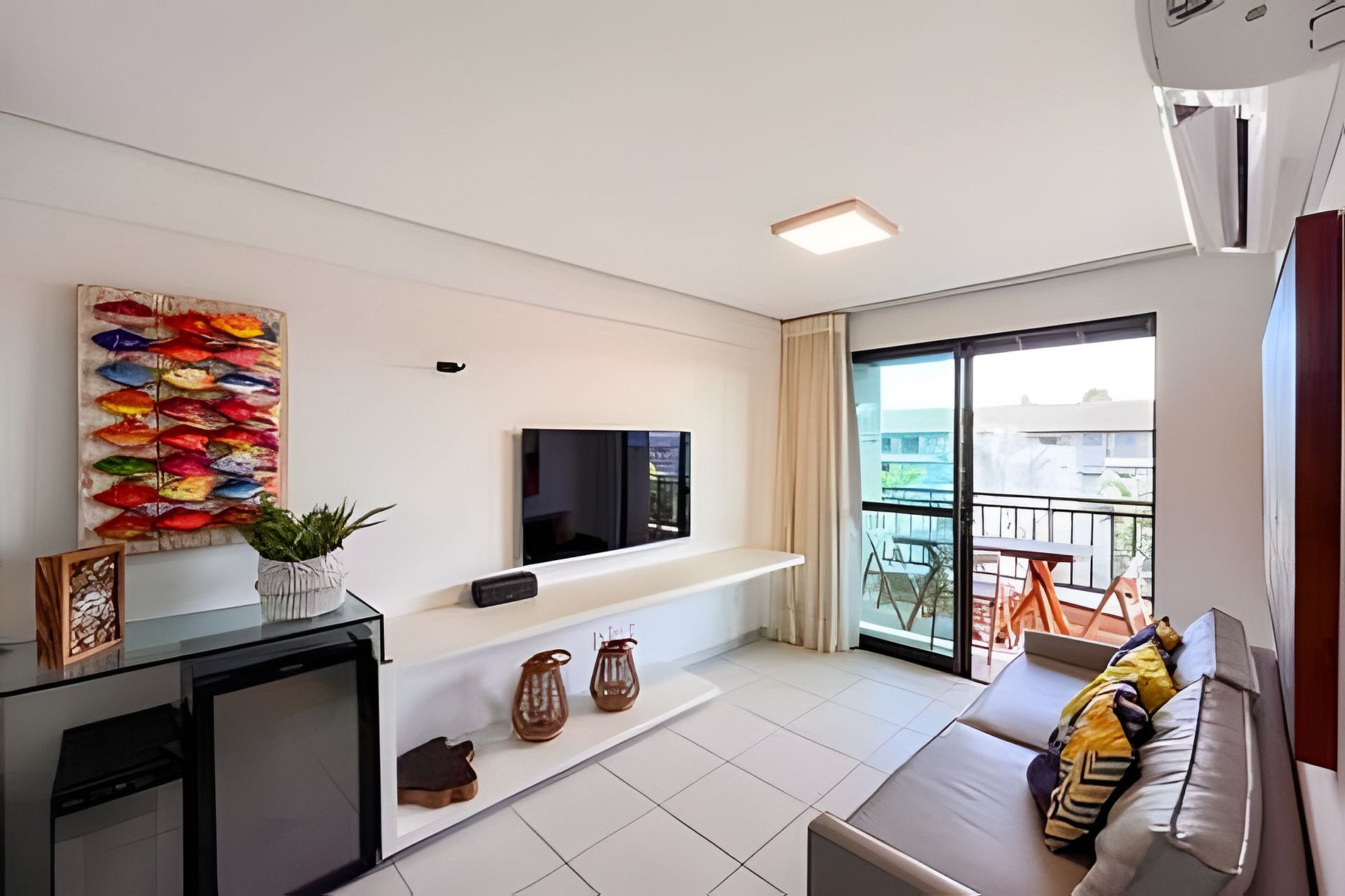 O apartamento conta com 3 quartos bem distribuídos, ideal para grupos de até 10 hóspedes, uma varanda privativa com vista para a piscina do condomínio